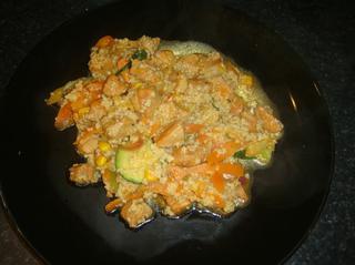 U nas vcera hubovy perkelt s haluskami, dnes morcacie stehno so zeleninou a kuskusom..