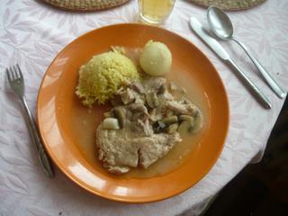 druhe: rezne z bravcoveho stehna na slanine a sampinonoch, ryza
