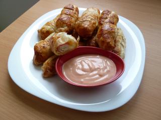 Ku krabej tycinke, ktore nerozmrazujeme, som dala pasik tvrdeno syra a zabalila som to do listoveho cesta. Cesto som si vyvalkala a nakrajala na take asi 5-7 cm siroke pasiky. No a potrela som to rozslahanym vajickom a posypala grilovacim korenim. Najprv mi to grilovacie korenie k tomu moc nesedelo, ale vysledny efekt bol super. Piekla som to tak 15-20 min. K tycinkam som spravila dresing pozastavajuci len z majonezy a kecupu 🙂