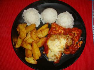 dnes dopapame zo vcera - kuracie rezne a zapecene rolky z kur. prs (so sunkou a syrom, len tak naukladane a zrolovane) a ryza... polievku takto varit nezvyknem, ked sme len dvaja, tu skor, len ked cez tyzden potrebujem nieco rychle spravit 🙂