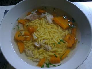 Hrstkova polievka s mrkvou a cestoviny s bravčovým mäsom a syrovo-brokolicovou omáčkou. Mäsko a syr sa mi musia rozmraziť (zabudla som to večer vytiahnuť, tak bude neskorší obed ) 🙂