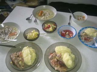 nedela:kapustnica s masovymi gulkami, kuracie rezne, fasirky, rolady so zemiakovym salatom