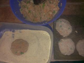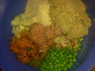 dnes sojovo-masové fašírky so zeleninou, - sojový granulát, mleté maso, nastruhaná mrkva, hrášok, cibula, cesnak, vajíčka, struhanka a dohutené podla nálady dnes trochu korenia na bravčové pečené a bylinkové korenie, k tomu zemiaková kaša do ktorej ja dávam majoránku a zmrazenú petržlenovú a zelerovú vňať