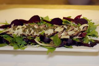 ked si stek odpocnienie, nakrajame ho na tenke platky, poukladame na salat, pokvapame dressingom, posypeme parmezanom (najlepsie na hobliny), oblozime cviklou a podavame.
