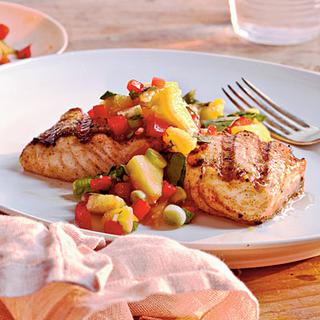 Grilovany halibut (dostat myslim v Tescu) s broskynovo-paprikovou salsou