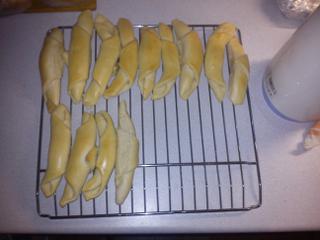 vsetky suroviny dame do pekarnicky najprv mokre,potom suche ale to urcite vies nechame vymiesit a vykysnut. Po vykysnuty vyberiem,cesto rozdelime na 4 casti,kazdu rozvalakme na placku prerezeme na trojuholniky a stocime od sirsej casti k uzsej,dame na plech vystlanym papierom na pecenie a nechame este cca 20minut podkysnut.Pecieme pri 190 stupnov doruzova,pred vlozenim do rury rozky potrieme rozslahanym vajickom