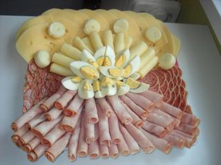 a, šunkovo-salámovo-syrovo-vajíčková misa, k nej b, jarný zeleninový mix (redkvičky, zelená cibuľka, uhorka, cherry paradajky, olivy, paprika a postrúhaná mrkva, c, torta pre oslávenca (moja prvá) a d, zemiakový šalát a vyprážané kuracie rezne v sezame). nestihla som síce všetko pofotiť, ale aspoň niečo: