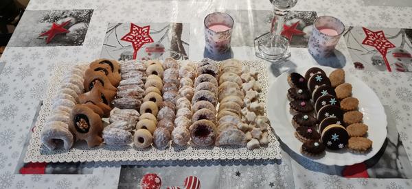 Po troške z každého: vanilkové rožky, medovníčky, orechove hviezdičky, škoricove hniezda, linecké, a jeden plnkovy väčšinou čokoládovo banánový koláč.