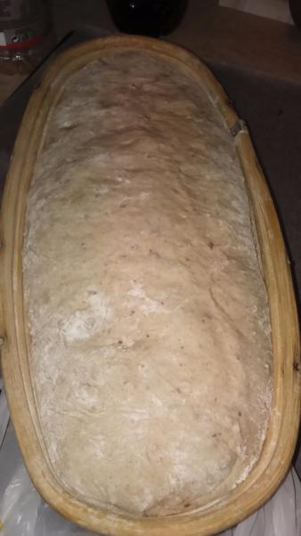 Štartér nechávam pôsobiť aj 12h, niekedy až zdvojnásobí svoj objem. Potom 2h miesim, prekladám a 3h nechávam kysnúť v ošatke.