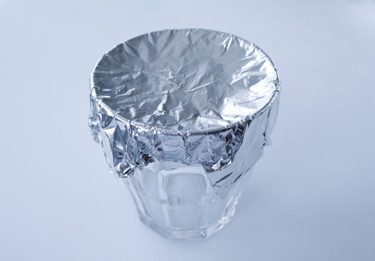 Start by covering the glass with double layers of foil, like shown on the photo. Dust it with a little cornstarch, so that the flower wont stick to the foil.
