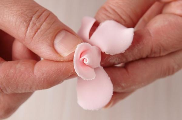 To make cones for the centre of the roses, work some white flower paste to soften it, roll it into a ball and then roll one side to a point to give a cone shape. The cone, when held in the centre of the cutter should come about halfway up the height of the petal.