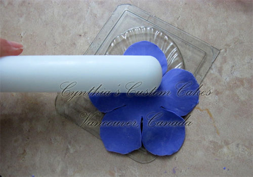 Place the petals on a pressure pad and dab lightly with cornflour, then rub over the edge with the dog-bone modelling tool. Hold the tool so it’s half on and half off the petal, so the petal flutes gently, rather than just cupping up.