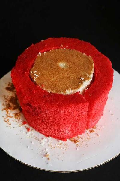 Step 8. This will show you the empty circle in the middle that will expose my ganached cake underneath that is still firm. Put dowels in and place your tier on it.