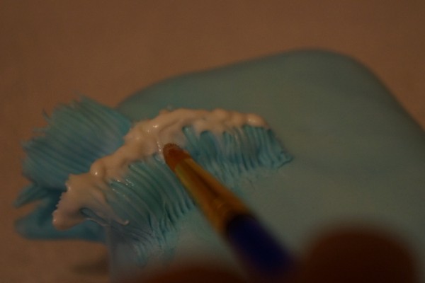 Step 7. I used a cutter to take away the excess fondant . Since we did not glue the whole strips top each other , it is easy to take away the excess here.