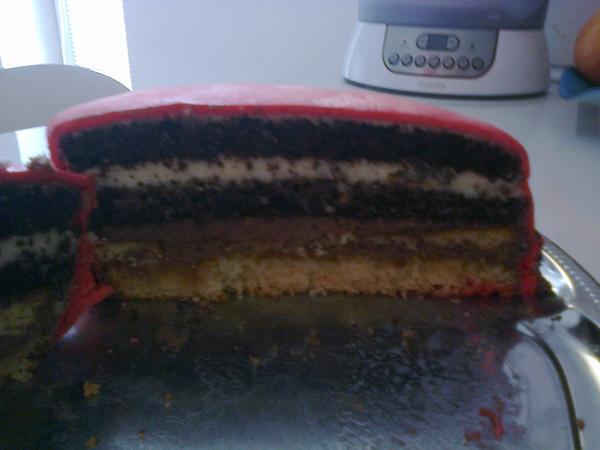 Všetky sypké prísady zmiešať, pridať tekuté a zamiešať. formu vymazať tukom a vysypať hrubou múkou. Pečiem pomaly na 150°C. Vychladnutý korpus prerezať na 3 časti a potrieť višňovým želé ( šťava z kompota a 3 lyž. solamylu povariť a nechať vychladnuť).
