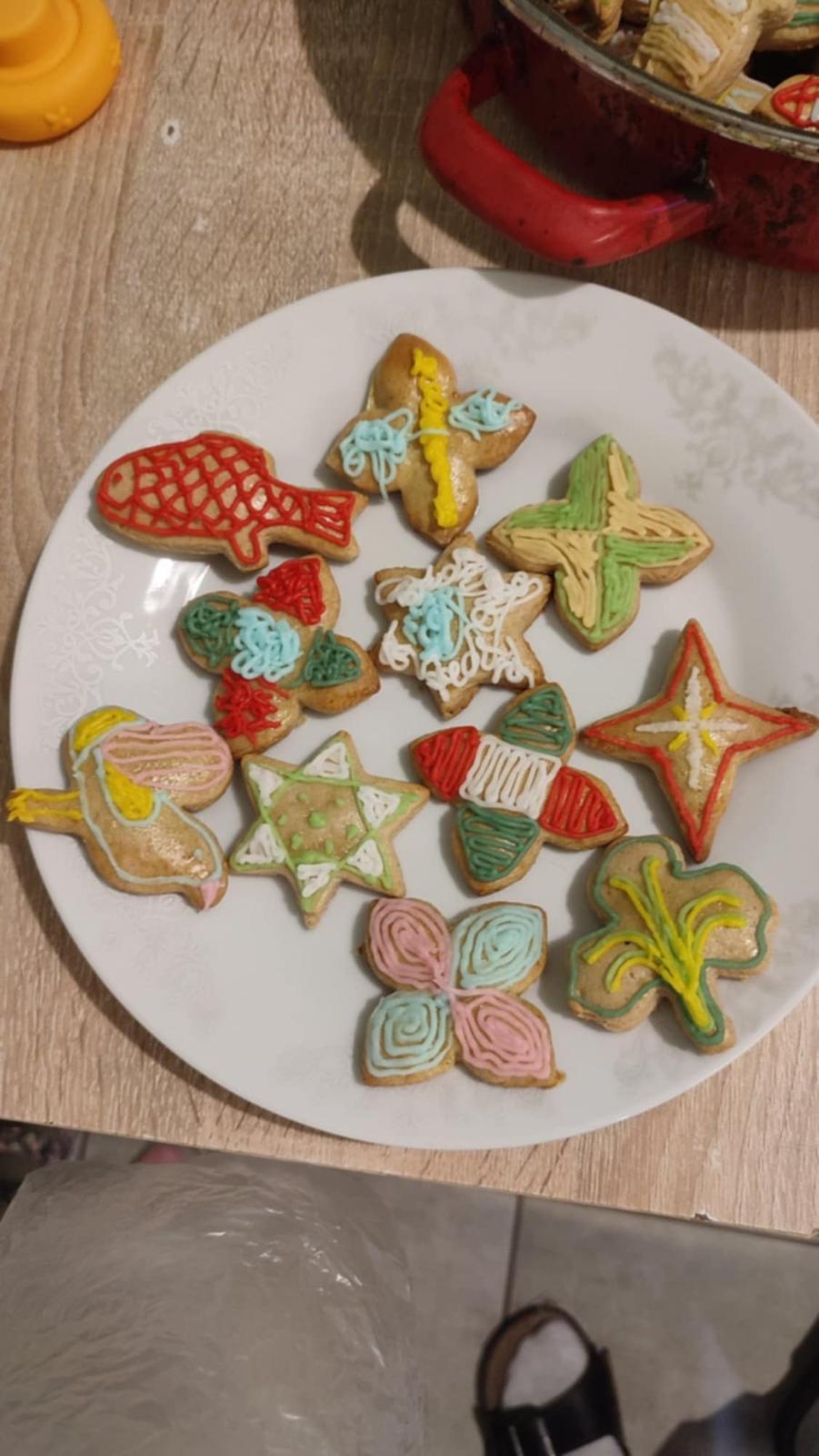 My nezdobime cielene, teda mama pečie a nezdobí lebo nikto nechce jest tu bielkovu hmotu s cukrom. Mame neozdobene a pojeme ich🙂