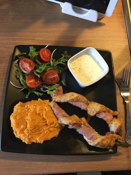 Špargľa s kuracinou a slaninou (ak chceš zdravšiu verziu, tak bez slaniny) a k tomu kasa z batatu, alebo môžeš nakrajat batat na hranolky a dať upiecť. A k tomu dresing z jogurtu a byliniek