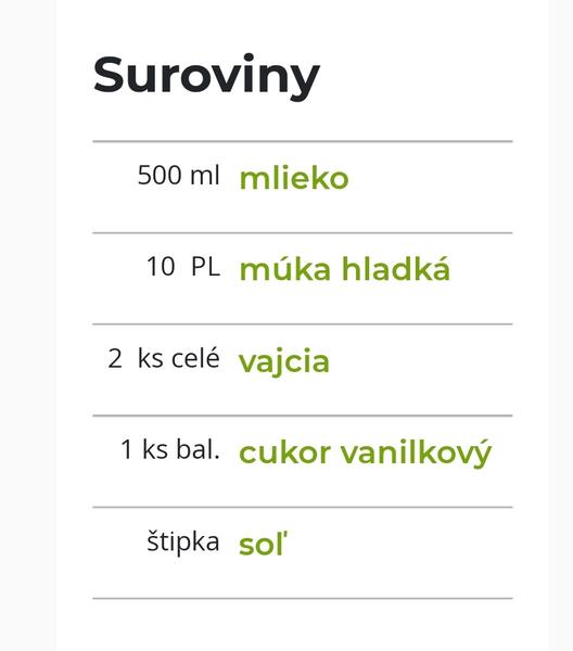 @vasjar Vyskusaj takto: 300 ml mlieka, 200 ml vody (moze byt aj perliva mineralka), 50 ml oleja (ja davam este menej), 2 vajicka, 3 PL kryst.cukru (alebo podla chuti)