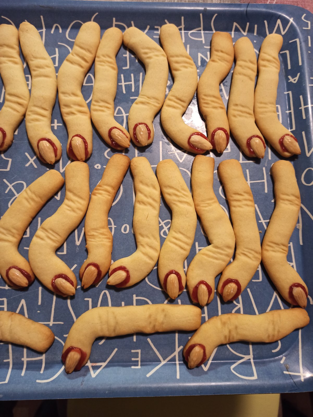 @kvadrinkaaa ďakujem cesto ako na linecké len sa to vytvaruje do takých prštekov a mandle sa použíjú ako nechty a červený džem ako krv.