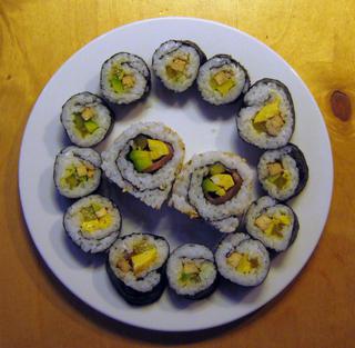 Holky, to sushi bylo s ruznou kombinaci uzeneho lososa, tamagoyaki (vajecna omeleta pripravena po japonskem zpusobu), avokadem, prouzky tofu a okurek nalozenymi v sojove omacce. A nektere jsme delaly s rasou uvnitr obalene sazamovymi seminky.