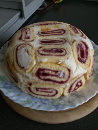 Na povrch torty naukladame zvyšne roládky (moze sa stat, ze vam ich neostane vela, tak kludne mozete dat piskoty). Takto hotovu charlotte dame do chladnicky aspon na 3hodiny (ja som to dala na celu noc). Po stuhnutí vyklopime na táaku a odstranime foliu.