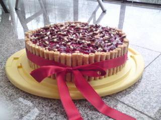 Gefrorene Himbeeren darauf verteilen und mit rotem Tortenguss überziehen.24 Stunden im Kühlschrank durchziehen lassen.