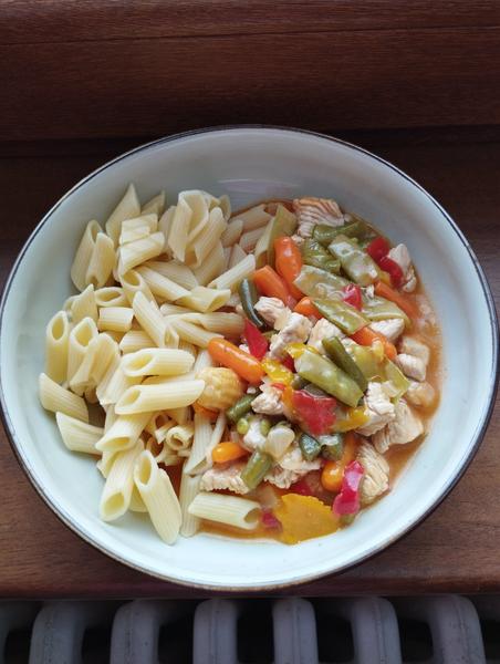 Nakrajat na pruzky, osmahnut, pridat mrazenu zeleninu, ochutit a podusit do makka. K tomu ryzu alebo zemiaky