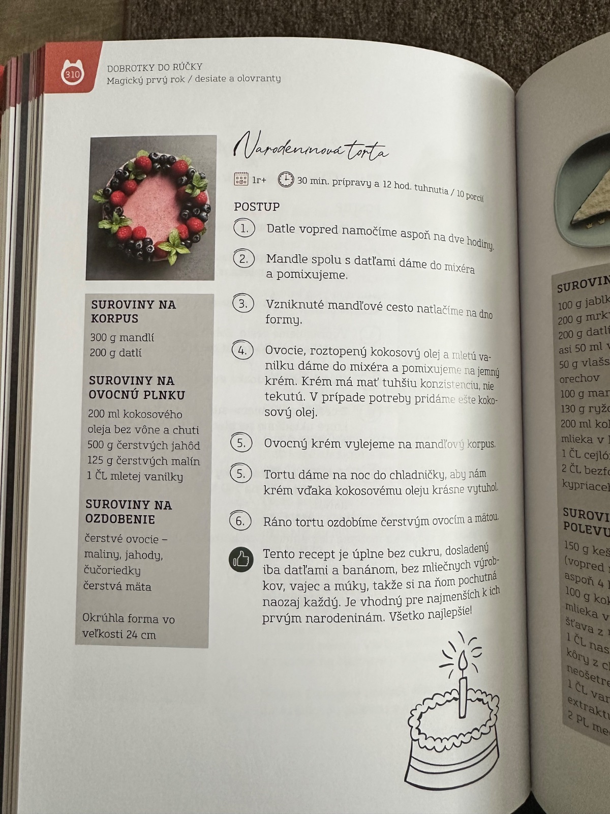@anonym_autor na 1.narodeniny... kludne nepecenu piskotovu s jablkami. Ak papa mliecne (jogurt, smotanu...) tak aj s tym. Receptov je vela len prisposobit. Fakt by som rocnemu nedavala kokosovy olej, datle a mandle.