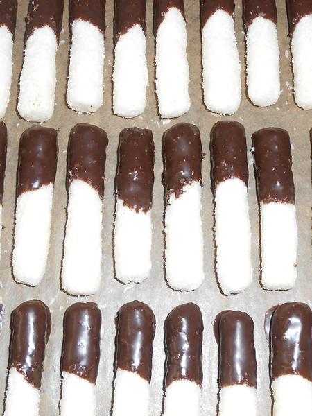 Vymiesat salko s cukrom, pridat kokos a tvarovat tycinky. Ja som ich nechala par hodin vysusit aby boli tvrdsie a potom som konce omacala v cokolade.