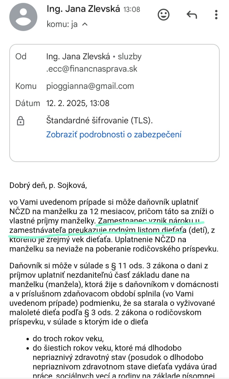 Ale účtovníčka v manželovej práci vyžaduje doklad z úradu práce, že ktoré mesiace som poberala rodičák - že len za tie je vraj nárok na nezdaniteľnú časť základu dane na manželku (mňa).