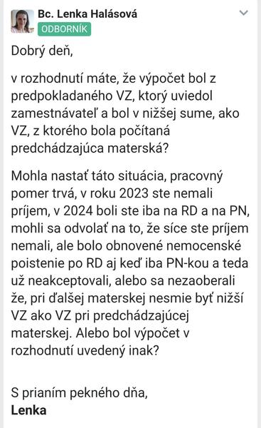 A čo sa týka tej rady z poradne, keďže je to vytrhnuté z kontextu (píše,že si pýtala radu od nej ešte predtým), ani sa nevyjadrujem, ale z PN tu materskú nemá. Zároveň neviem prečo čakala materskú rovnako ako predtým, keďže o reťazenie tam nejde. Dokonca o to,že materská nemôže byť nižšia ako predchádzajúca ide len vtedy, keď sa vychádza z PVZ. Keď žena napr začiatkom roka robí, nastúpi na materskú a tesne po pôrode otehotnie a na nasledujúci rok nastupuje na ďalšiu materskú, aj keď medi touto a predchádzajúcou nemá nič odrobené, druhá materská sa počíta z pdrobeneho začiatku predchádzajúceho roka pred predchádzajúcou materskou a teda môže byť iná ako prvá materská, hoc ide o reťazenie... Takže nie vždy platí čo tu na MK prečítaš...