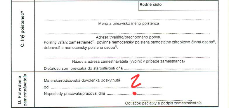 Dobrý deň, idem si po radu, keďže mi zamestnávateľ dal do kolónky, ktorú by mal vyplniť, len pečiatku a podpis. Rada by som to mala správne vyplnené. Do sociálnej poisťovne som sa žiaľ nedovolala, tak skúsim takto.Momentálne som na RD s prvým dieťaťom.