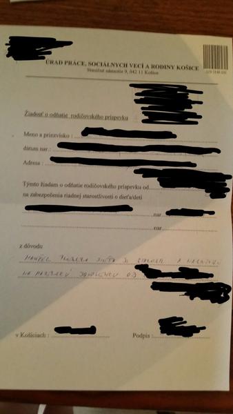 Baby mám vyplnené tlačivá: Ziadost o odnatie rod.prispevku, Dohoda medzi rodicmi o prevzati dietata do star., Ziadost o materské-otec.