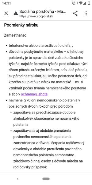 @lorika6988 Skús kuk pravne pre rodica. Narok na rodicovsky budes mat po porode automaticky do 3 rokov veku dietata. (Ak ti nepriznaju matersku). Na to aby ti priznali matersku musis byt nemocensky poistena 270dni za obdobie 2rokov (to by malo platiť aj pre uplatnenie tehotenskeho). Takto cca, skus kuk na nete este😉