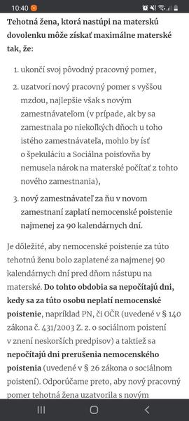 @77zuzka7 Pocuj, ty nerozumies? Nemas u noveho zamestnavatela VKUSE 90 dni bez prerusenia Pn alebo OCR: Ved pises, ze v marci si bola na OCR, cize si od toho 8.1. nenazbierala 90 dni vkuse - preto sa ti tehotenske nepocita z noveho PP. A v pripade, ze ostanes na PN az po porodu/nastupu na matersku a nevychadza tu od 8.1. vkuse 90 dni bez PN a OCR, tak ani materska ti nepojde z noveho PP.