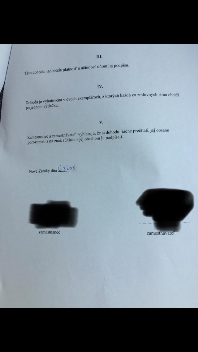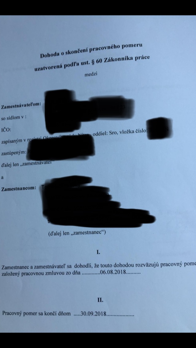 @laurika26 oprava, nedostal výpoveď dohodli na skoneční pp dohodou k tej novej zmluve ktorá bola na Tpp na dobu neurcitu od 6.8. - všetko na novej zmluve bolo rovnaké ako na predošlej aj plat len iná pozíci (aj keď to mala byt dohoda nie tpp) Ten istý deň ako nástup na md. Takze podpísal pz 6.8. aj dohodu o jej skončení ktorá bola od 6.8. Do 30.09. S podpisom k 6.8. Neviem či to píšem zrozumiteľne :( čiže bola vôbec plátna ta výpoveď alebo zmluva? Už som z toho debil 🤦♀️
