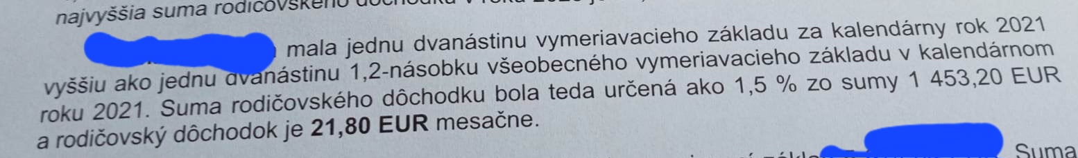 @belaanabela aj sestra bola časť roka 2021 na rodičaku , za ňu tam je uvedená suma z ktorej sa to ráta a koľko to vychadza. ale mamina je rada aj za to malo, teraz keď jej to došlo naraz tak ju to potesilo