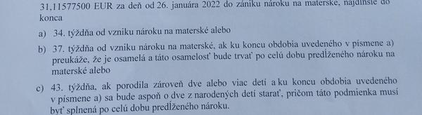 @effy777 čo ťa na tom mätie? To je všeobecné tlačivo pre oznámenie nároku na materské. Máš tam uvedené odkedy máš nárok a iba oznamujú vo všeobecnosti ako dlho sa poberá - to sú tie tri možnosti. Ja som napr. bola možnosť b.) - o predĺženie som žiadala cca 2 týždne pred koncom štandardnej dĺžky materskej (tých 34 týždňov). Dávala som čestné prehlásenie o tom, že žijem len s dieťaťom - aj tak boli zo sociálky preverovať u susedov či je to tak. Materské ti začnú vyplácať od 26.01.2022 a končí ti 20.09.2022 - to si vlastne na MD - od 21.09.2022 požiadaš na ÚPSVaR o rodičovský príspevok a od 21.09.2022 do dovŕšenia 3 rokov dieťaťa budeš na RD.