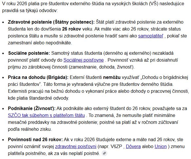 @anonym_autor Ale ak študuje externe a nie dennou formou, tak nemá štatut študenta predsa. Veď na ňu ani rodinné prídavky nedostavaš už. Takže by mala pracovať na TPP a nie nejaké brigády. Plus ten vek 26r.