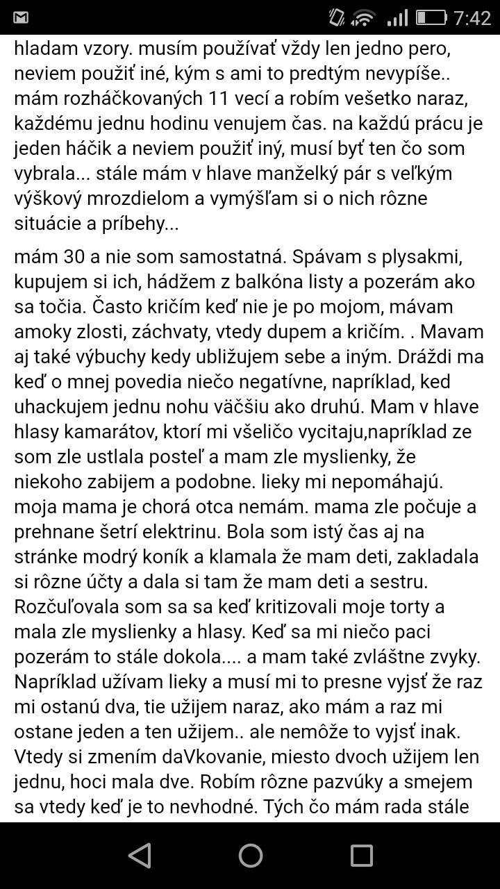 Ach ako to čítam ďalej je mi z toho smutno, neviem ako pomôcť takému človeku, neviem kde má daná osoba rodinu, či jej pomáhajú, či nie. Duševné choroby sú veľmi ťažké a zle a mali by nato myslieť všetci čo sa necítia okej, že netreba otáľať s návštevou psychológa/psychiatra kým nieje neskoro. Dúfam že sa autorke polepší a dúfam že sa lieči, ak nie tak že sa veľmi rýchlo začne a vydrží