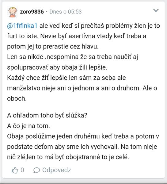 @zoro9836 čiastočne súhlasím. Mam ale pocit, že autorka mu ustupuje až príliš a on neustupuje vôbec. Nesmie sa nechať ponizovat od neho, a on si to nesmie dovoliť. Jej manžel si ju neváži. Vieš je ine doťahovať sa ako dochutiť kura, a iné keď ju zhadzuje a neustále jej niečo vyčíta. Ty by si svoju ženu už poslal do teplých krajín. A inak, asi tu není diskusia kde by si neprispel. Co mne je fuk, ale narážam na to, že z čítania tvojich príspevkov je zrejmé, že väčšinou držíš stranu chlapom. Na mamickovskom fóre. Ona sem napísala, s tým, že potrebuje radu od ženy. To, že jej napíšeš, že sa nemá urážať, jej urcite pomoze. To teraz potrebuje. Zjavne ma už toho dosť a pol roka sa mu snaží variť, prať, upratovať, zarábať a pánko bude riešiť ci je mastný fľak na chladničke. Akože fakt máš pocit, že sa nesnaží? Pozeráš občas zámenu manželiek? Viem extrém, ale nazries do domácnosti presne takýmto typom mužov. Co ženu za všetko buzeruju. Nepoviem občas, aj ja poviem mužovi, miláčik tieto tvoje ponožky furt každé ráno pri posteli mi idú na nervy. A on mi povie, prepac zlatko dám si na to pozor. Vtedy to ma zmysel. Ale keď cieľom jeho dňa je chodiť po nej s hľadať na nej chyby nech ide do zadku. A tie ženy potom na tej kamere plaču, a trasu sa a nevedia ci sa majú vrátiť domov. Taky život? To ako fakt?