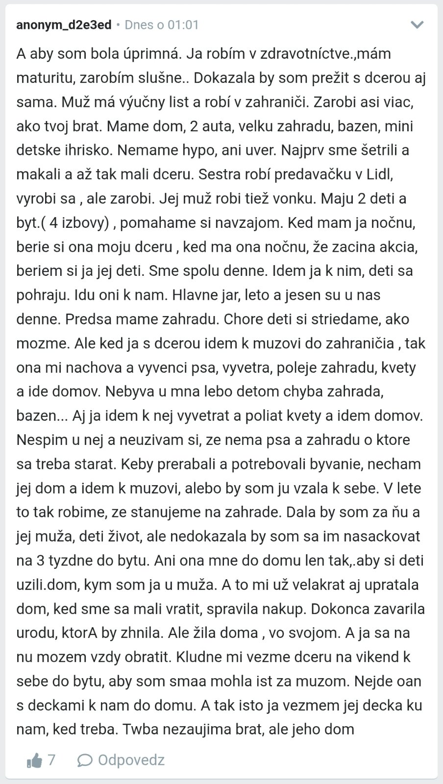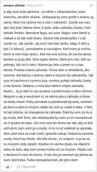 A aby som bola úprimná. Ja robím v zdravotníctve.,mám maturitu, zarobím slušne.. Dokazala by som prežit s dcerou aj sama. Muž má výučny list a robí v zahraniči. Zarobi asi viac, ako tvoj brat. Mame dom, 2 auta, velku zahradu, bazen, mini detske ihrisko. Nemame hypo, ani uver. Najprv sme šetrili a makali a až tak mali dceru. Sestra robí predavačku v Lidl, vyrobi sa , ale zarobi. Jej muž robi tiež vonku. Maju 2 deti a byt.( 4 izbovy) , pomahame si navzajom. Ked mam ja nočnu, berie si ona moju dceru , ked ma ona nočnu, že zacina akcia, beriem si ja jej deti. Sme spolu denne. Idem ja k nim, deti sa pohraju. Idu oni k nam. Hlavne jar, leto a jesen su u nas denne. Predsa mame zahradu. Chore deti si striedame, ako mozme. Ale ked ja s dcerou idem k muzovi do zahraničia , tak ona mi nachova a vyvenci psa, vyvetra, poleje zahradu, kvety a ide domov. Nebyva u mna lebo detom chyba zahrada, bazen... Aj ja idem k nej vyvetrat a poliat kvety a idem domov. Nespim u nej a neuzivam si, ze nema psa a zahradu o ktore sa treba starat. Keby prerabali a potrebovali byvanie, necham jej dom a idem k muzovi, alebo by som ju vzala k sebe. V lete to tak robime, ze stanujeme na zahrade. Dala by som za ňu a jej muža, deti život, ale nedokazala by som sa im nasackovat na 3 tyzdne do bytu. Ani ona mne do domu len tak,.aby si deti uzili.dom, kym som ja u muža. A to mi už velakrat aj upratala dom, ked sme sa mali vratit, spravila nakup. Dokonca zavarila urodu, ktorA by zhnila. Ale žila doma , vo svojom. A ja sa na nu mozem vzdy obratit. Kludne mi vezme dceru na vikend k sebe do bytu, aby som smaa mohla ist za muzom. Nejde oan s deckami k nam do domu. A tak isto ja vezmem jej decka ku nam, ked treba. Twba nezaujima brat, ale jeho dom