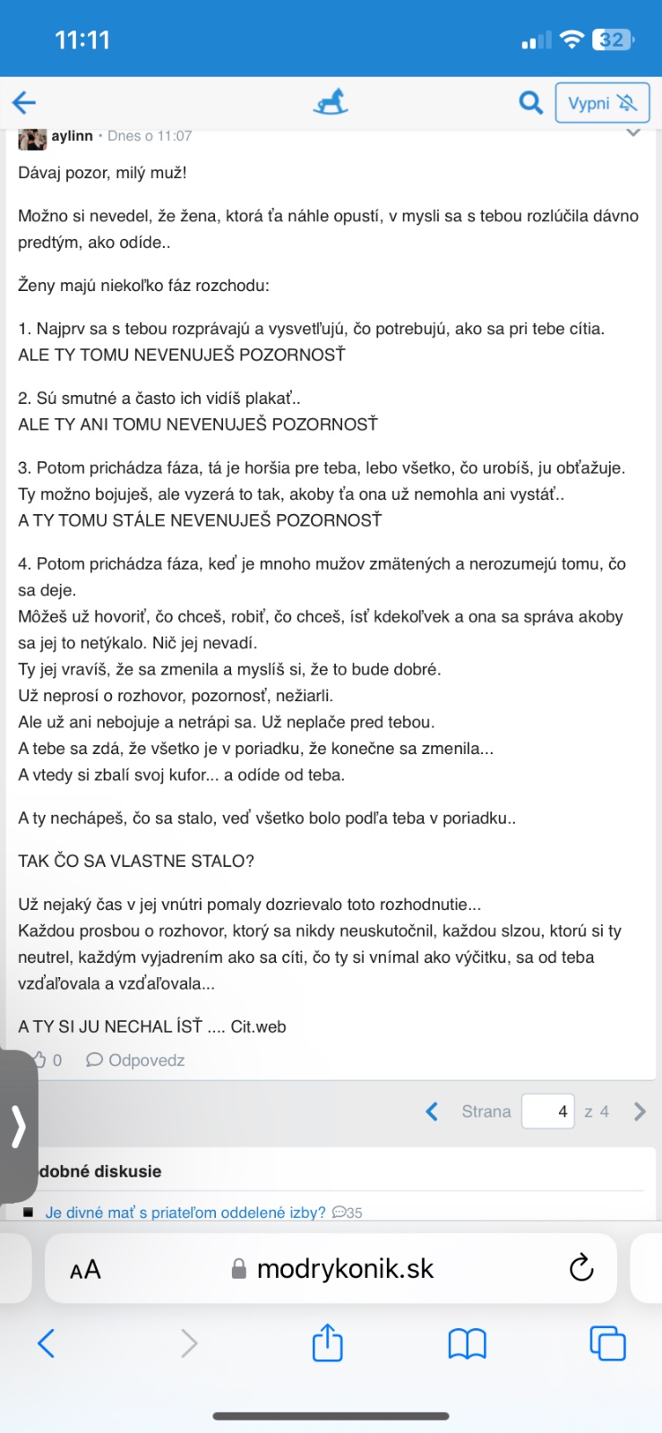 Ahojte. Som muž a manželstvo sa nám rozpadá.Sme spolu 13 rokov a 11 rokov sme manželia.Máme dve dcéry a majú 9 a 2.O deti a o rodinu sa starám nepijem a nefajčím .Mali sme pekné manželstvo ale zopár krát som som manželke ublížil a to slovne alebo skutkami. Skutkami myslím tak že som sa jej nevenoval tak akoby si to celkom zaslúžila. Nikdy som jej fyzicky neublížil.Povedala mi že jej chýba láska objatia atď čo som jej aj prejavoval ale asi nedostatočne.Pred nedávnom som jej ublížil jedným slovom a povedala že toto bola posledná kvapka že už viacej nevládze. Pred pár dňami som zistil že si píše zamilované správy s iným mužom ale neviem presne od kedy a aj sa stretli len neviem či došlo k niečomu medzi nimi.Chcel by som manželstvo zachrániť lebo ju milujem a nechcem ju stratiť.Chcel by som aby sme znovu boli ako šťastná rodina.Ona stále hovorí že uvidíme čo bude ďalej to chce čas ale viem že pritom si stále píšu. Som zúfalí z toho celého lebo neviem čo mám robiť a