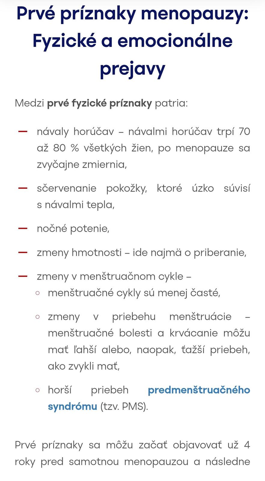 Ako keby si pisala o mne. Mam cez 40, mavam lepsie obdobia a horsie. Na navaly mi pomohol menoxin a pupalka, ale teraz pri dalsej krabicke menoxinu mam velmi citlive prsia, tak som vysadila. Citala som ze je to estrogenove a ten podporuje aj bujnenie buniek v tele, tak chcem skusit nieco na baze progesteronu, ze vraj vitex jahnaci. Kupila som od terezie menopauzu, kde by to malo byt, ale este cakam, kym sa vyplavi menoxin. Zavrate nastastie nemam, ale panicke ataky, ked som pod velkym tlakom. Od roku 2018 mavam sny kazdu noc. Strieda sa to s nocnymi morami, rano sa budim nevyspata, unavena, ako keby som to cele prezila na zivo. To pozeranie do blba po veceroch, ked vsetko utichne, poznam. Vcera som mala snahu citat, po minute mi padali viecka. Minule som zaspavala na pracovnom telefonate, ze mi hlava padla do zadu a buchla som si ju o vrch stolicky l. Unava cez den, zly spanok, nervy a stresy, podrazdenost.