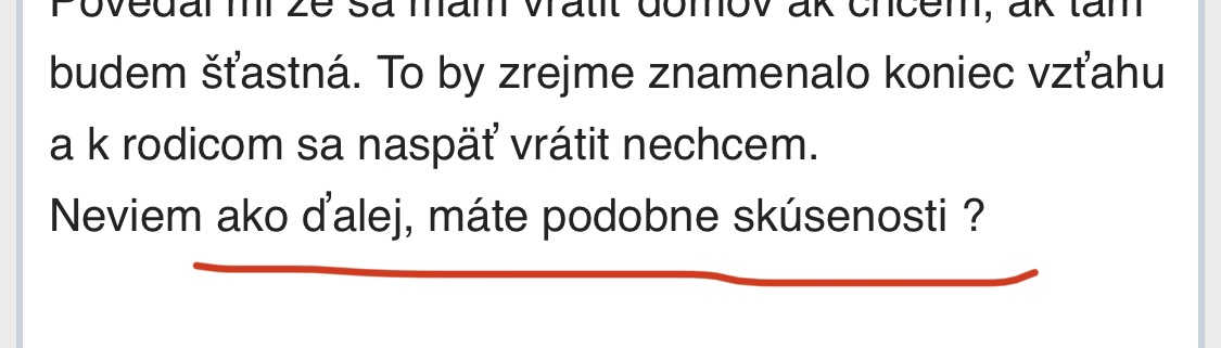 Povedal mi že sa mám vrátiť domov ak chcem, ak tam budem šťastná. To by zrejme znamenalo koniec vzťahu a k rodicom sa naspäť vrátit nechcem.