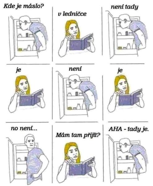 Môj tiež nevie nikdy nič nájsť, či oblečenie alebo jedlo v chladničke. Koľkokrát sa nakúpia paradajky, paprika akože na raňajky, ale on si ich nikdy nezoberie, lebo predsa on ich v chladničke nevidel. Všetko mu dávať na tanier a podať do ruky. Minule som šla k rodičom, vravím, na sporáku máš naparenú knedľu, v chladničke mäso, kapustu a šťavu na poliate knedle. Prídem domov, pýtam sa, jedol si, hej, mäso so suchou knedľou a bez kapusty, lebo on predsa zabudol 😀