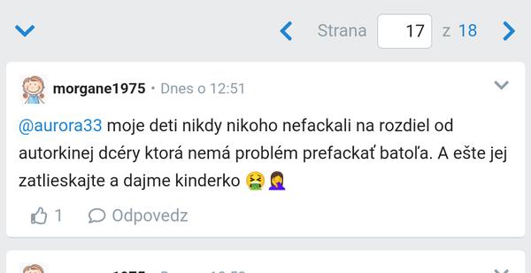 @morgane1975 citam to tu od zaciatku, uz nie raz mi padla sanka nad niektorymi....ale ty...hmm nie si ty ta agresivna matka, co bez problemov vyfacka cudzie dieta? Alebo si takto uz tiez "vychovala" nejake dieta od susedov, lebo sa poskriepilo s tym tvojim? 🤮