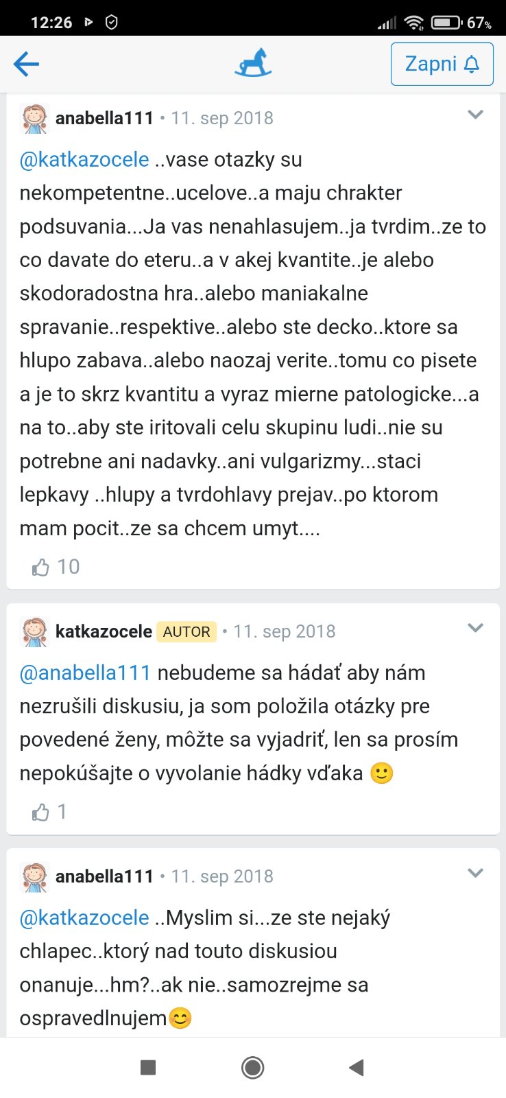 @katkazocele ty sa nevyhovaraj co si pisala v uvodnom prispevku, co komentar to hovadina tak sa teraz netvar ze my nesieme zodpovednost za tie bludy co si popisala, za tie sa zodpovedaj sama svojej operenej kamoske!