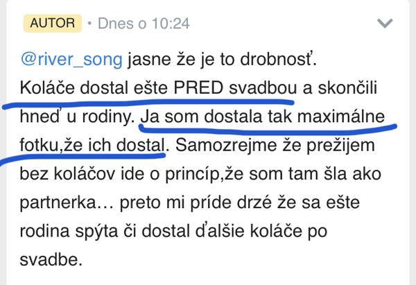 @h2 áno,to je taký zvyk,o tom píšem. Kto je pozvaný na svadbu,ten dostáva koláče,on bol pozvaný,išiel s priateľkou, jasné že myslela,že teda je to aj pre ňu a áno bolo to aj pre ňu. Píšem, že u nás je presne takýto zvyk aj keď koláče prinesú pred svadbou. V podstate je to zanedbateľná vec,ale ja píšem, ako je to zvykom u nás a asi tak to chápala aj autorka. Vy to máte asi inak🤔.