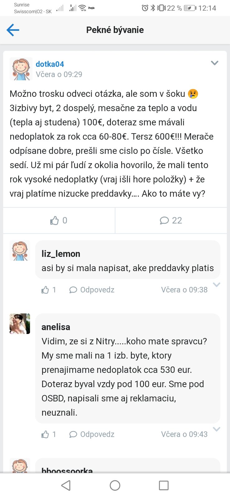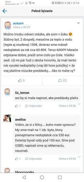 @whatever1 Nás to nahnevalo, pretože sme s tým nedoplatkom nerátali. Áno, pomohla nám, to je pravda pravdúca. Ona sama povedala, koľko chce a koľko budú zálohy. Ale v tomto nám klamala, pretože na zálohy nedala toľko čo bolo dohodnuté. Neviem prečo, chápem, že chce z toho prenájmu niečo, ale mohla to povedať narovinu a my by sme si dávali peniaze za energie bokom. Pretože je to jej byt a je tam hlásená ona, teda len jedna osoba, tak je logické, že keď tam budú dvaja, minie sa viac vody, elektriny.. takto prišiel nedoplatok, lebo keď Ti niekto povie, že zálohy sú xx€ a zistíš nakoniec, že to tak nie je, tak prepáč, ale toto sa fakt nerobí. A chápem, že nie je charita, aj chápem, že sa dostala do situácie, že chcela vyšší nájom. Ten sme jej aj platili, potom sme sa odsťahovali.